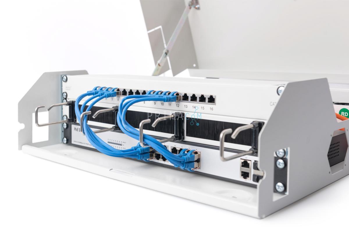 Aan de achterkant (vast) is een horizontale 2U-rail bevestigd, die bijvoorbeeld kan worden gebruikt voor passieve netwerkcomponenten.