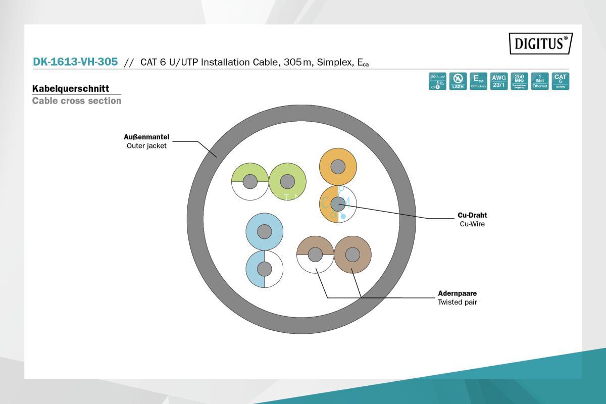 DK-1613-VH-305 CAT 6 U-UTP installatiekabel, 250 MHz CPR Eca (EN 50575), AWG 23/1, 305 m paper box GHMT certified